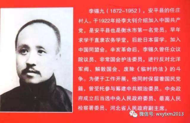 与此同时,安平籍第一个共产党员李锡九,也于1923年被李大钊派回原籍,并先后发展李少楼等三人入党。1924年2月,弓仲韬与李少楼取得联系,二人通力合作,积极发展壮大党的组织。于同年3月,在北关高小和敬思村相继建立了党支部。至此,安平县已发展党员近二十人。