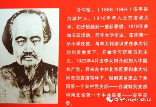 安平县隶属河北省衡水市,总面积493平方千米。弓仲韬于1923 年和1924年分别组建了中国共产党第一个农村支部——台城特别支部和河北省第一个中共县委——安平县委,开创了中国农村党建的先河。台城特别支部、安平县委的诞生,给燕赵大地带来了革命火种,使沉闷的华北平原出现了前所未有的生机和活力。自此,河北人民的革命斗争如火如荼地发展起来。