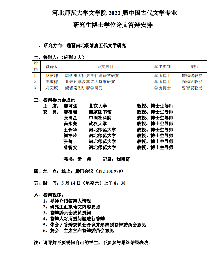 2022届中国古代文学专业博士答辩安排(14日答辩)