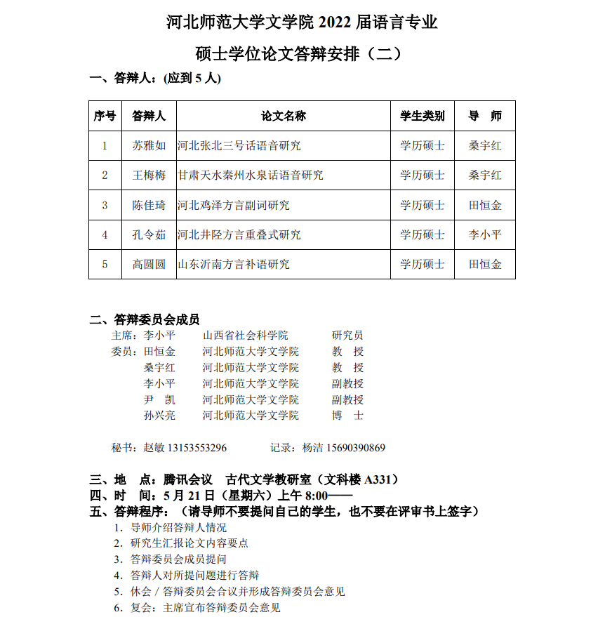 2022届语言学硕士研究生学位论文答辩安排(21日答辩)