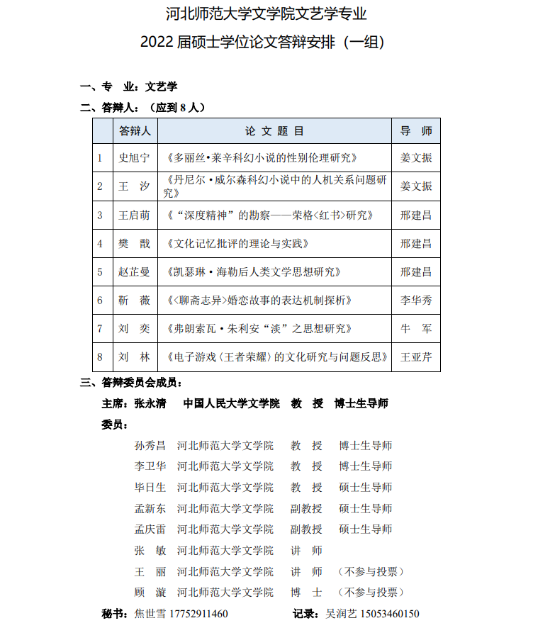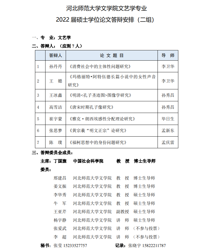 2022届文艺学硕士学位论文答辩安排(14日.16日答辩)