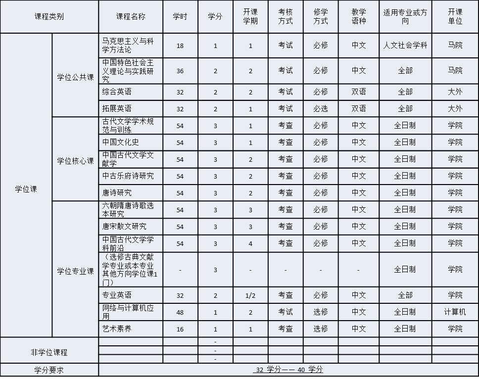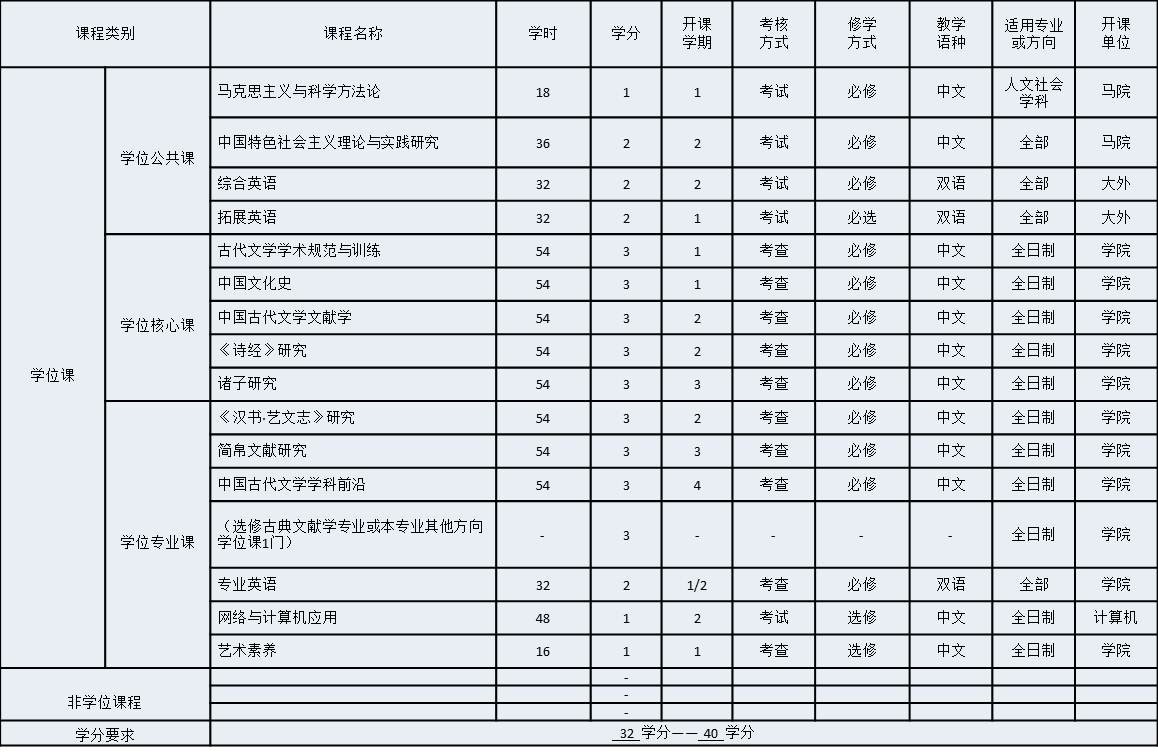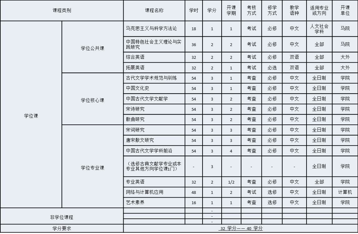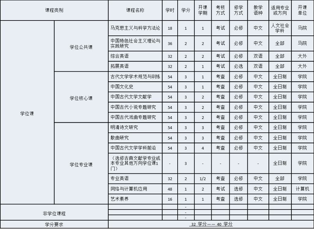 1. 中国古代文学研究生培养实行学分制。课程总学分不少于32个学分,不超过40学分。